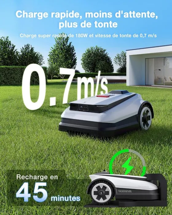 La batterie durable de 5Ah offre une charge ultra-rapide avec un temps d’arrêtminimal, se rechargeant entièrement en seulement 45 minutes grace à la chargerapide de 180W. Elle permet de tondre jusqu’à 500 mètres carés de manière fluideet continue.
